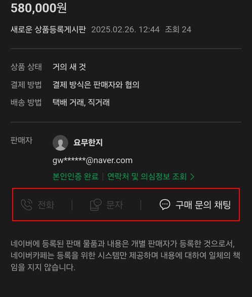 실제 아래 캡처는 사기 판매자가 네이버 카페에 작성한 글로 다크모드가 적용되어 있으며 전화나 문자가 활성화되어 있지 않습니다.