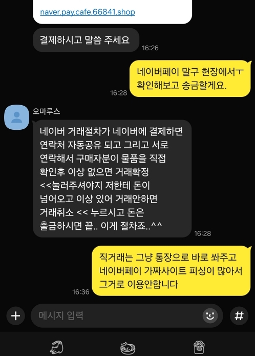 그러면 카톡으로 대화 중 네이버페이 안전 결제 링크를 보내주며 결제를 하면 연락처가 공유되고 서로 물품 확인 후 거래 확정을 누르면 된다고 하며 결제를 유도하며 직거래인데도 전화번호를 알려주지 않습니다.