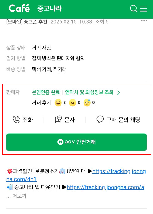 게시글에서 판매자에게 전화나 문자가 가능하며 거래 후기가 있으니 그걸 꼭 참고하세요.