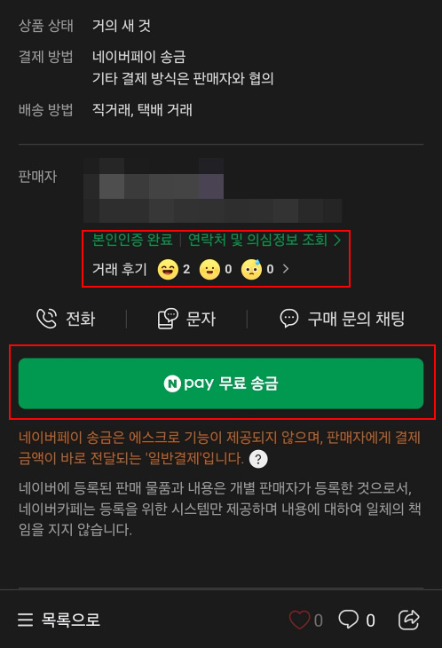 그리고 중요한 것은 결제 방법인데 판매자가 안전거래로 네이버페이를 선택하면 게시글 하단에 '네이버 페이 무료 송금'이 있습니다.