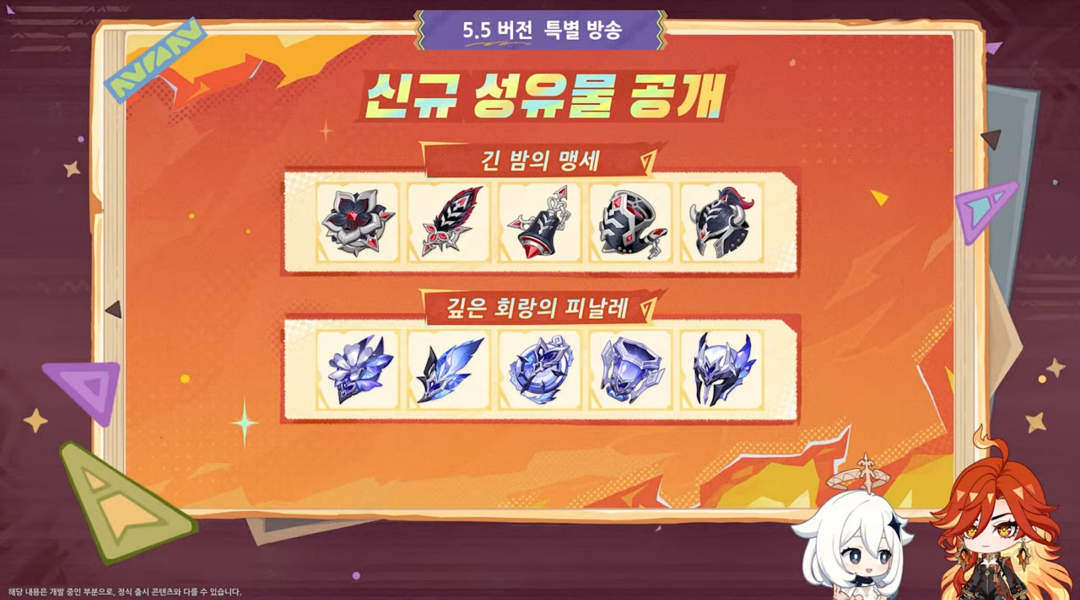 5.5 버전에서 신규 성유물 2종이 추가되며 하나는 바레사가 사용하는것 같은데 다른 하나는 아직 비공개 지역인 '노드크라이'의 이야기가 담겨져있는 성유물로 다음에 나올 신규캐릭터를 위한 성유물로 추정됩니다.