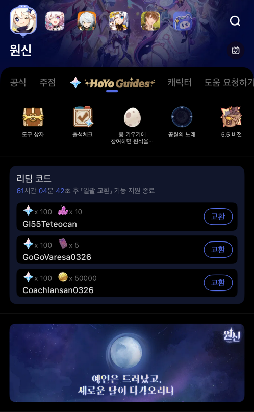 참고로 원신 5.5 버전 특별방송 리딤코드는 호요랩 앱에서 교환할 수 있으니 호요랩 앱을 설치후 교환하시길 권합니다.