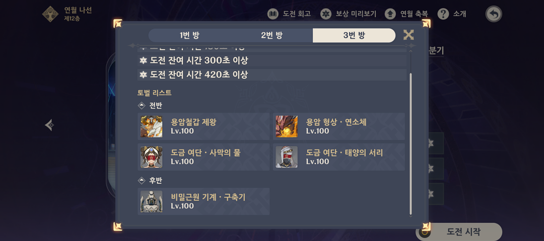 이번 나선비경 12층의 난이도는 크게 어렵지 않았으며 캐릭터 육성이 잘 된 분들은 쉽게 클리어할 수 있을 거라 생각합니다.