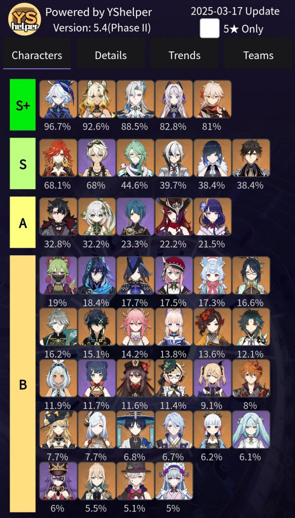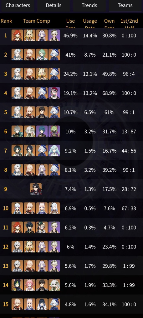 통계는 위챗에서 가져온 것이며 몹몰이가 안되는 몹들이 많아서 그런지 바람, 얼음, 번개 원소 캐릭터들의 픽률은 낮으며 물, 불 원소와 나타 캐릭터들도 픽률이 높습니다.