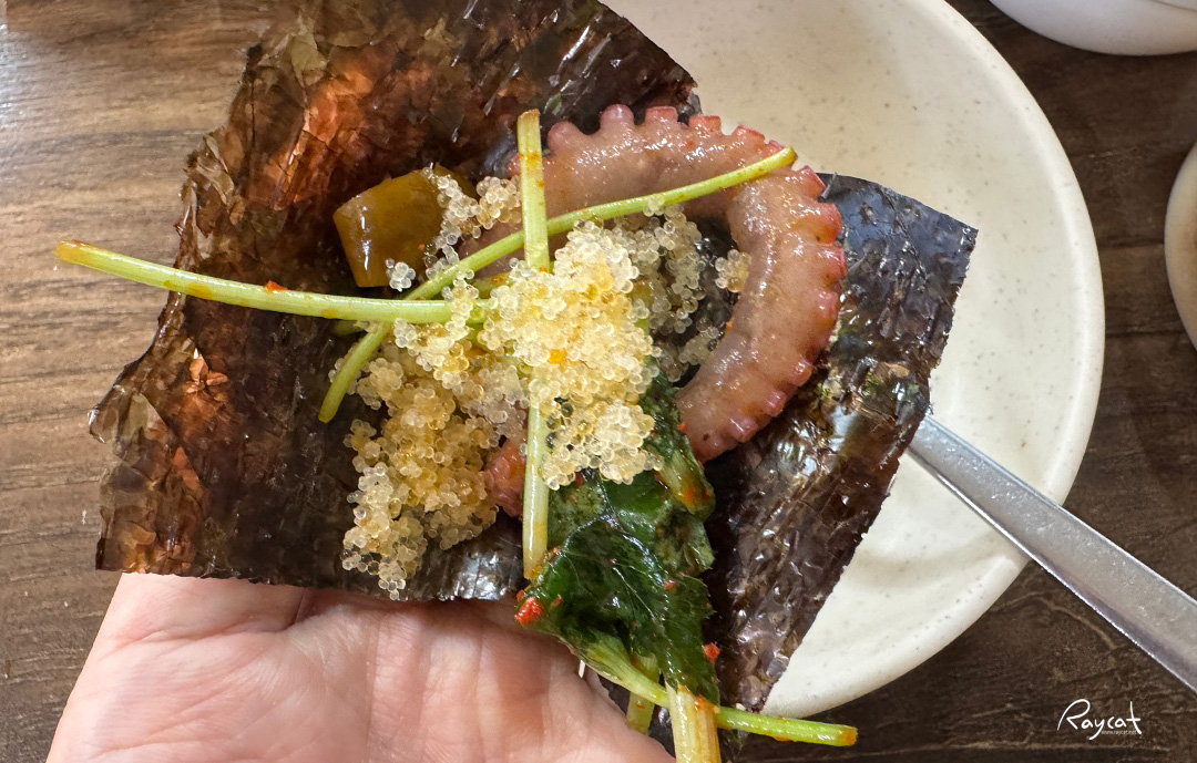이 집의 별미는 김과 함께 고추, 낙지, 날치알, 미나리를 놓고 김에 말아서 먹는 것인데 이게 꽤 맛있습니다.