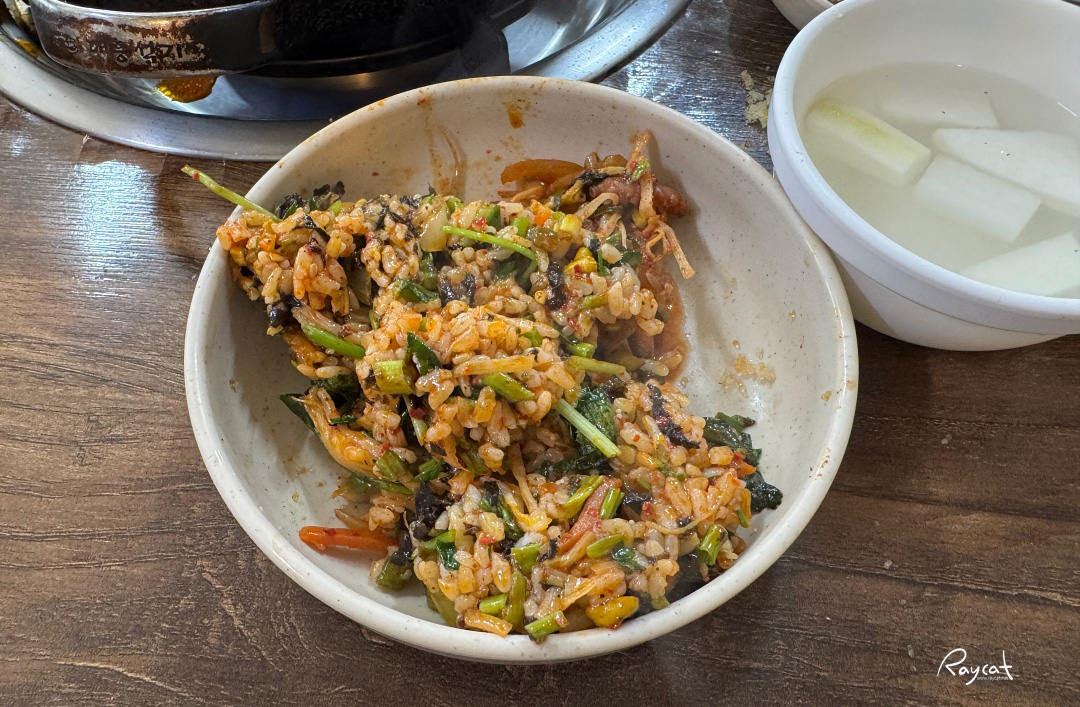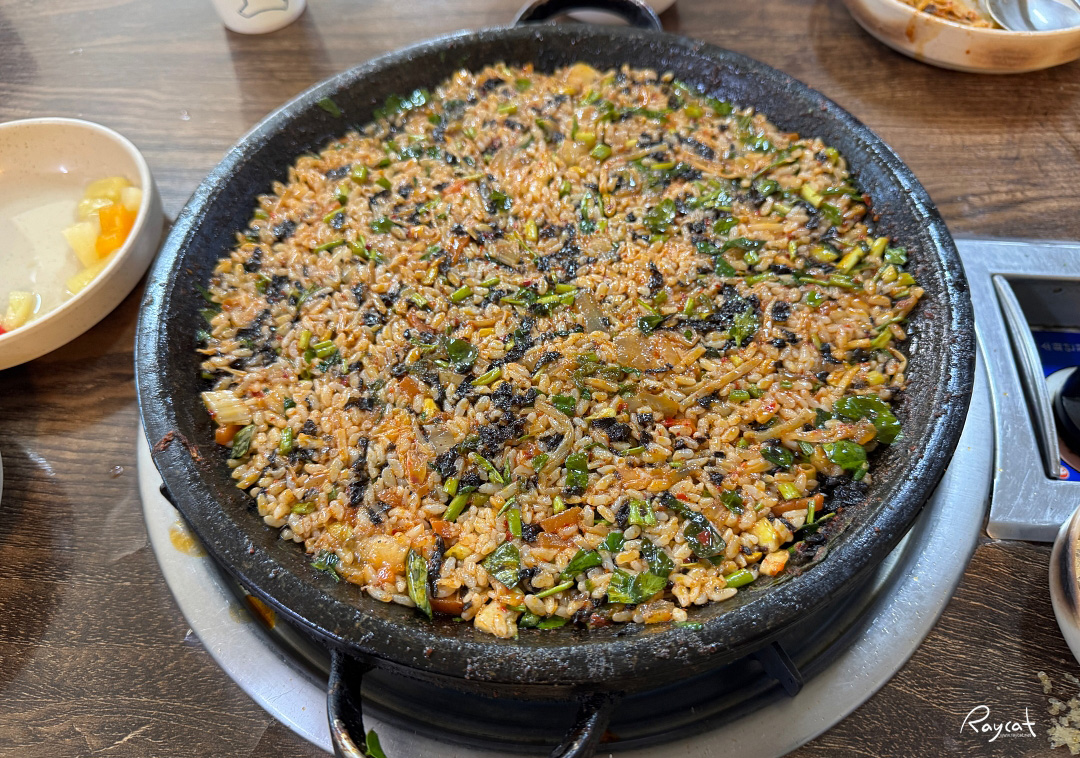 낙지를 다 먹고 남은 재료에 밥과 야채, 김 그리고 참기름을 넣어서 돌판에 볶아서 가져다주는데 고소하면서 매콤한 그리고 불맛이 느껴지는 볶음밥이 나옵니다.