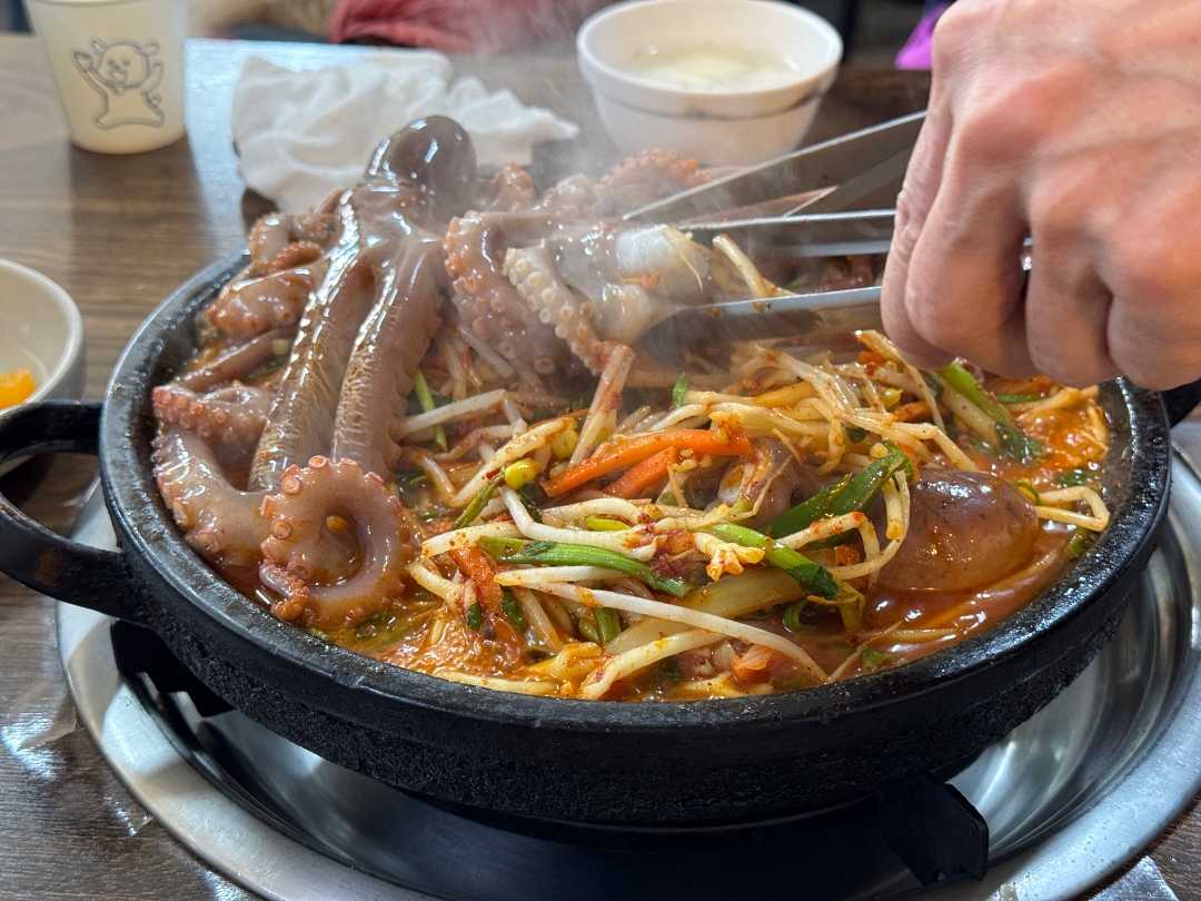시간이 조금 지나 낙지가 익기 시작하면 종업원이 와서 낙지를 대충 잘라주며 낙지 이빨을 제거해 줍니다.