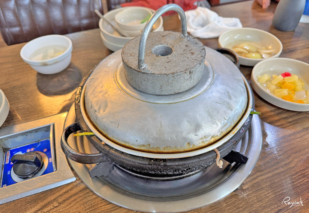 낙지찜을 주문하면 돌판에 야채와 산낙지를 가져와 바로 테이블에 얹어 주는데 산낙지가 움직이기 때문에 뚜껑 위에 아주 무건운 쇳덩이를 올려줍니다.