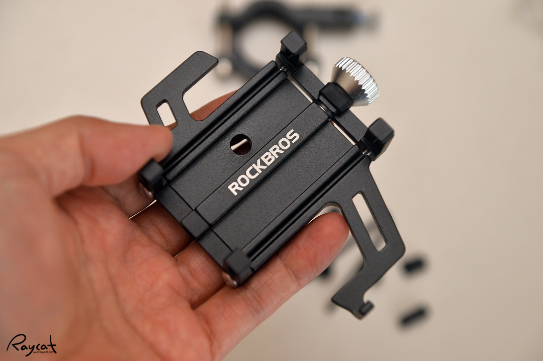 굵기는 조절이 가능하기 때문에 핸들바가 굵은 자전거에도 장착할 수 있으며 두 개의 볼트로 조절해 장착할 수 있는 구조로 위쪽에 휴대폰 거치대를 설치해 고정하게 됩니다.
