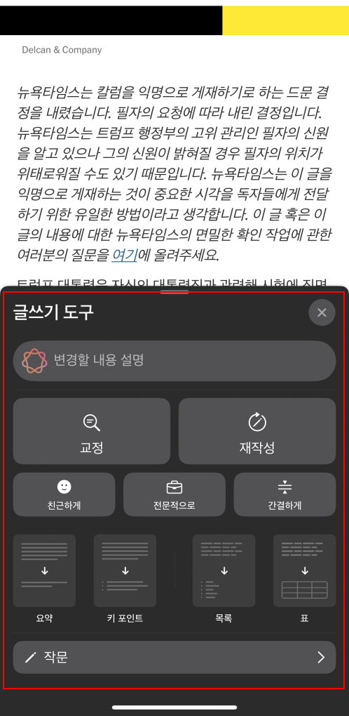 만약 문서를 작성하거나 혹은 웹페이지에서 번역 후 한글로 다듬고 싶다면 애플 인텔리전스의 글쓰기 도구를 활용할 수 있습니다.