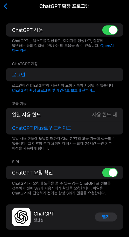 챗GPT를 유료로 사용하고 있다면 계정을 연결하면 기존 계정에 있는 그대로 애플 인텔리전스와 함께 챗GPT를 같이 사용합니다.