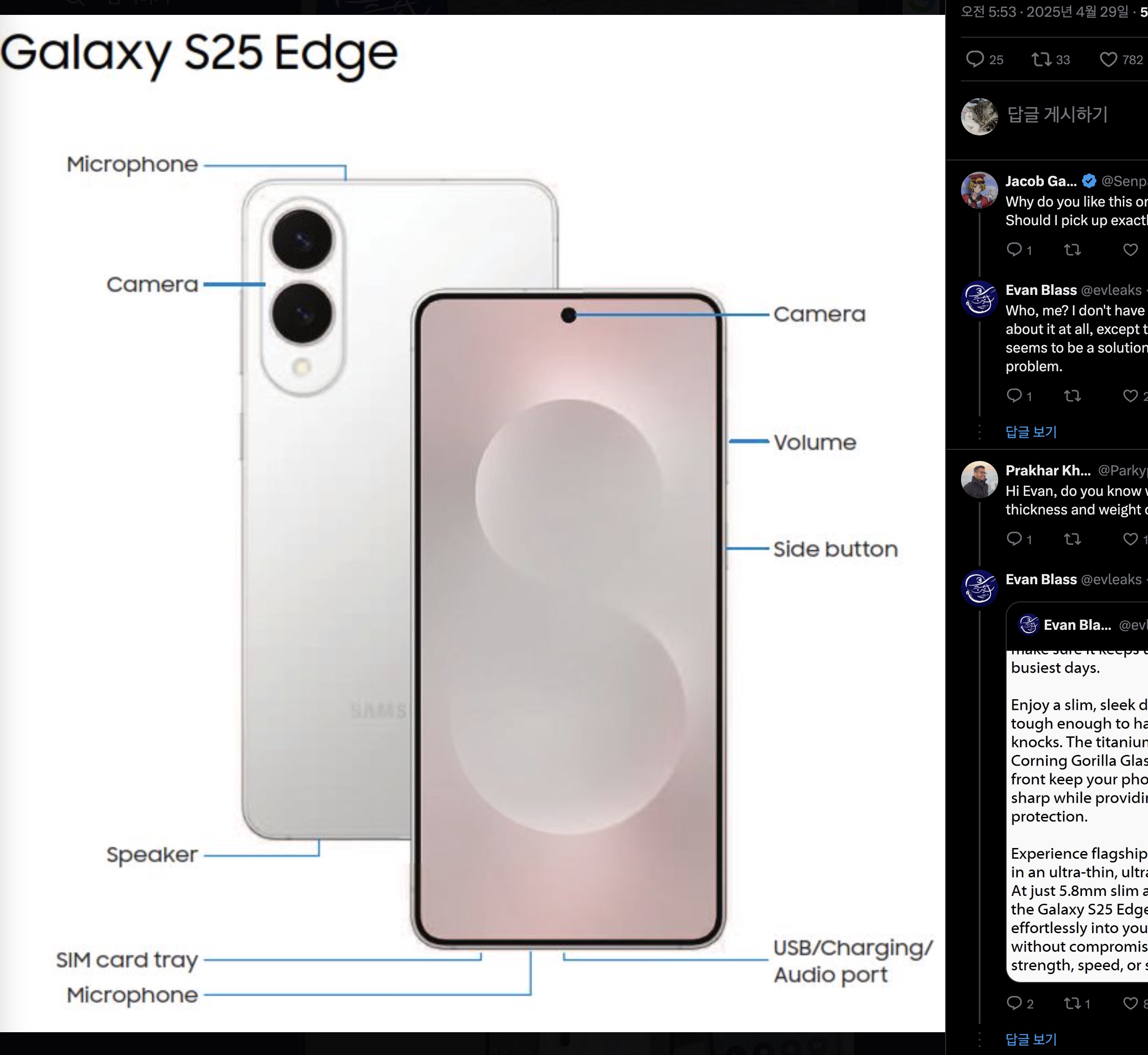 프로 유출러라 불리는 @evleaks가 자신의 트위터에 갤럭시 S25 엣지의 변경된 디자인을 공개 했습니다.