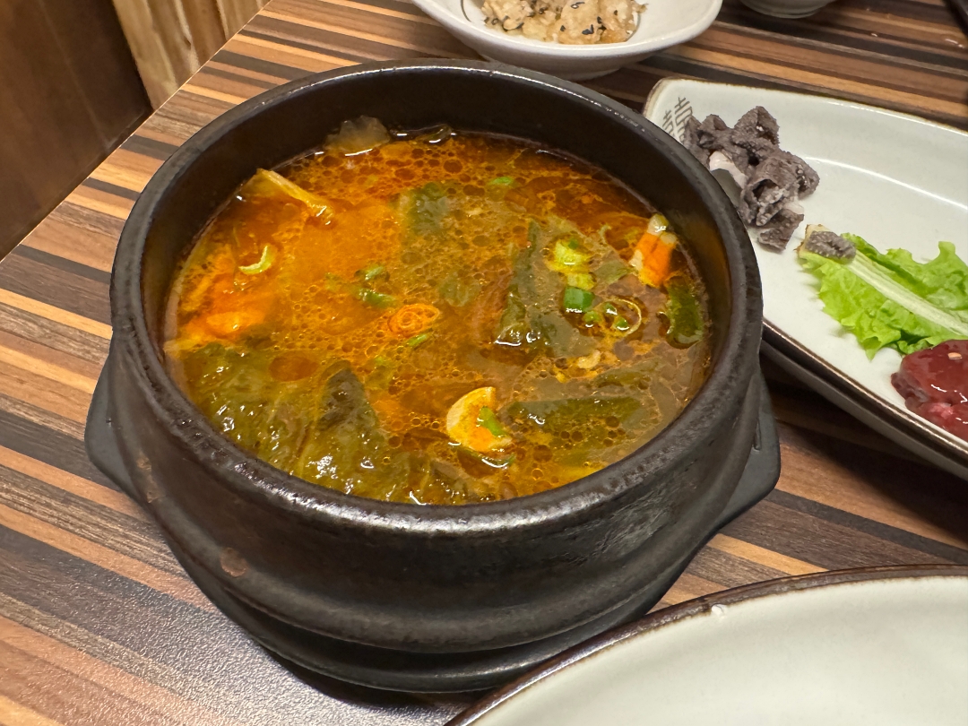 다른 기본 반찬들도 깔끔하게 나오며 선지국도 하나 같이 나오는데 밥 말아 먹어도 괜찮은 국물 맛이다.