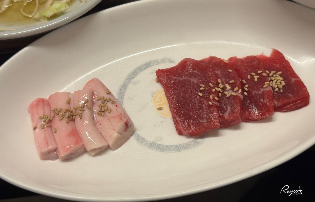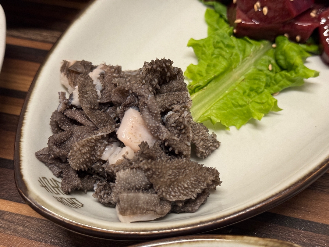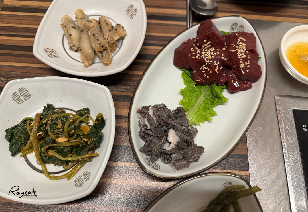고기를 주문하면 기본 상차림에 신선한 간, 천엽, 등골, 육사시미가 맛보기로 같이 조금씩 나오는데 이건 못 드시는 분들도 있어서 맛보기는 혼자 먹은 듯하다.