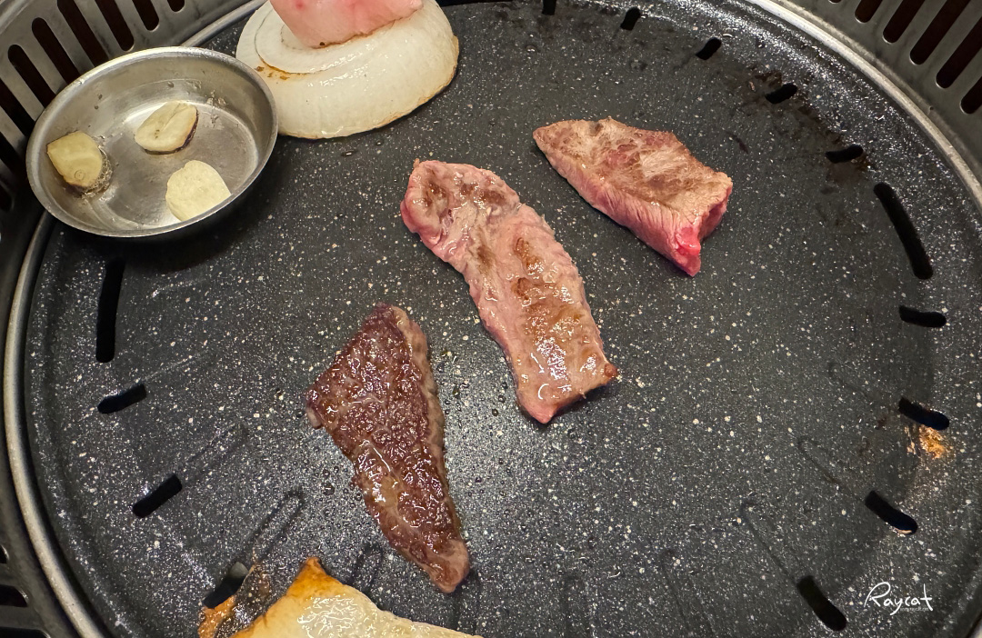 오늘의 메인인 여러 부위가 섞인 '오늘 뭐 먹지'는 그날그날 나오는 부위가 조금씩 바뀌는데 갈비살, 살치살등이 섞여 나왔는데 1등급 한우만 파는 곳이라 일단 고기의 품질은 보장하는 곳인데 홍성이 한우로 유명한 곳이라 특히 소고기가 맛있는 곳이다.