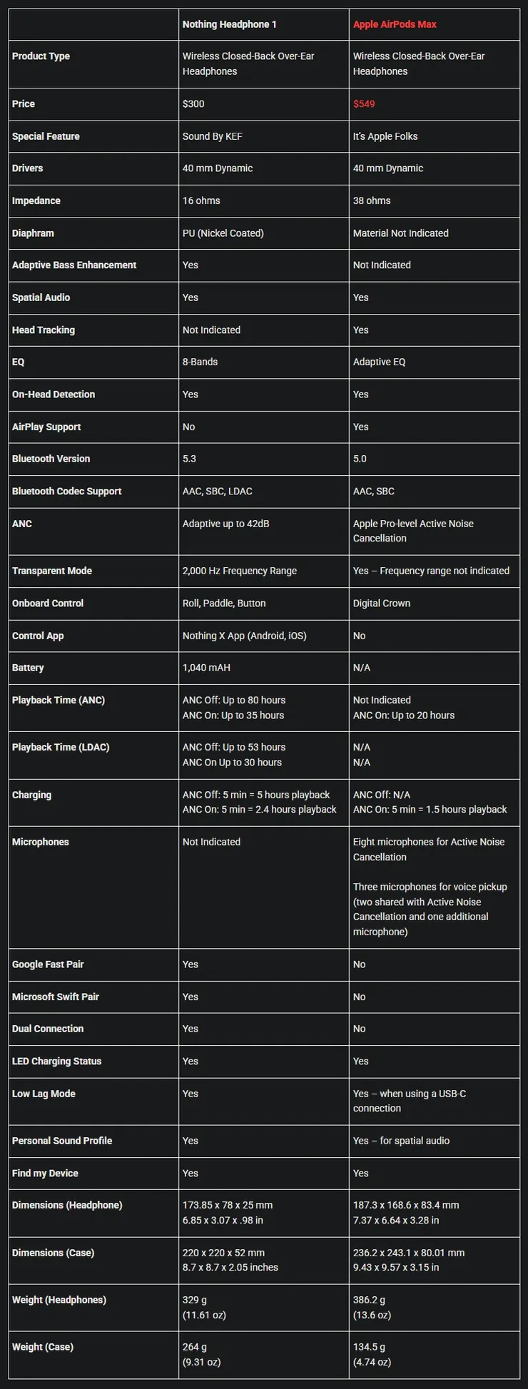아래는 낫싱 헤드폰 1과 애플 에어팟 맥스와 비교한 스펙인데 가격대비 경쟁력을 보여주는 것 같습니다.