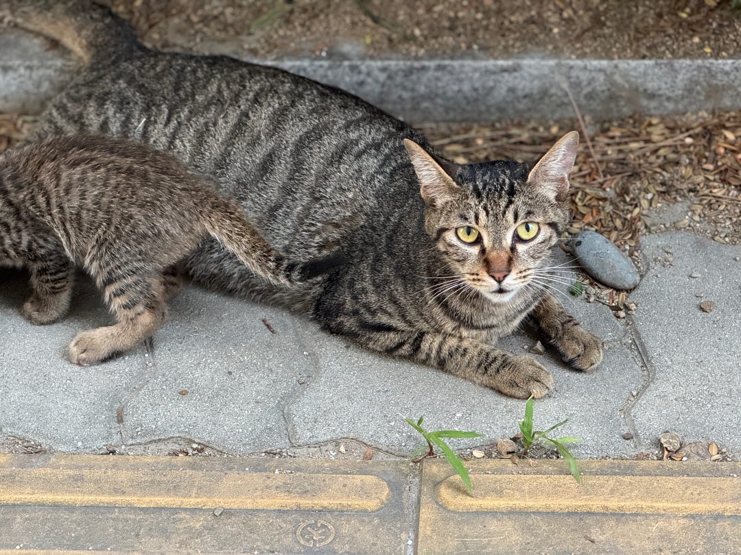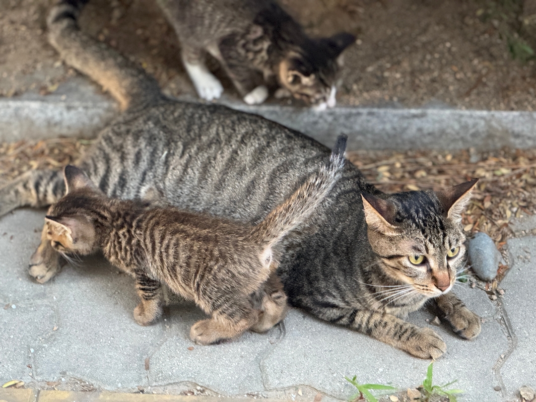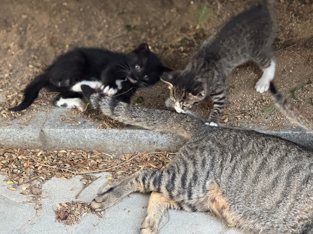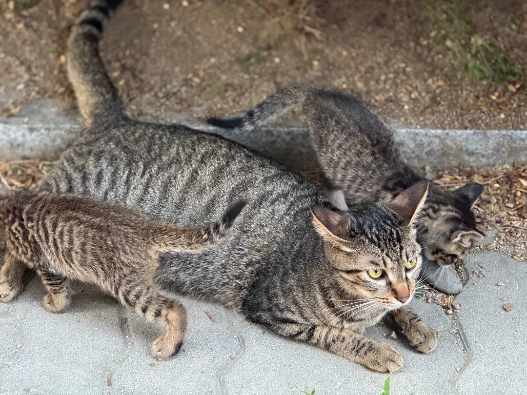 아마 그동안 사람 눈에 보이지 않게 숨겨두고 있었던것 같은데 아기 고양이들도 3개월 정도 되면 보통 활동이 활발해지다 보니까 어미 고양이가 쉬고 있을때 구석진 곳에 숨어 있다가 점점 바깥 세상으로 나들이를 시작한다.