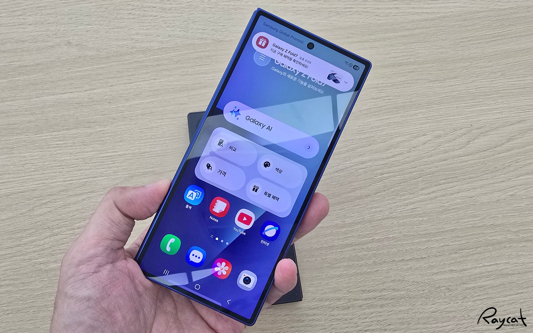 원 UI8이 적용되었으며 접은 상태에서 손에 쥐어보면 갤럭시 Z 폴드7은 일반 스마트폰과 비슷한 비율에 가벼운 무게와 두께 덕분에 접어서 커버 디스플레이를 보면 일반 스마트폰과 차이를 느끼기 힘듭니다.