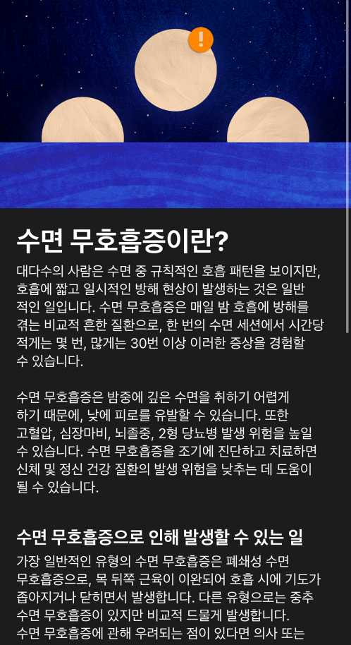 애플워치 사용자는 ‘건강’ 앱에서 수면 무호흡에 관한 참고 정보를 읽을 수 있습니다.