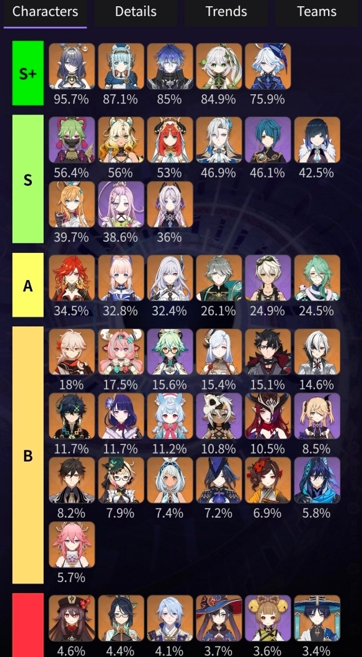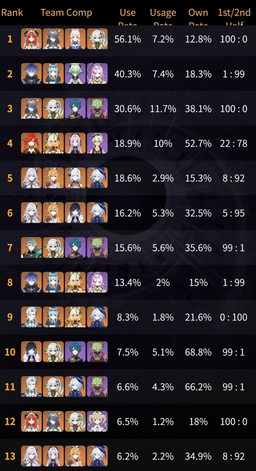 위챗의 픽률과 파티 조합을 봐도 이번에 노드크라이 캐릭터인 라우마, 플린스, 이네파, 아이노의 티어가 올라갔으며 픽률이 상당히 높은 편입니다.