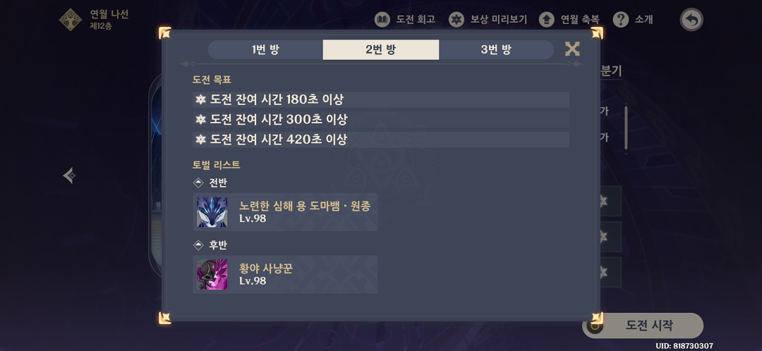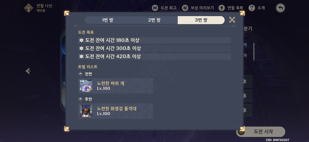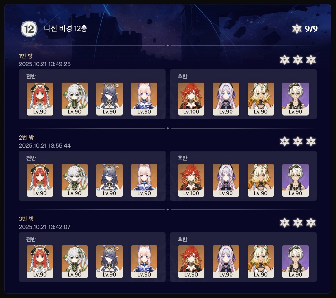라우마가 있으면 달 개화 파티를 활용해 닐루, 나히다, 라우마, 코코미로 전반부를 그리고 후반부는 가장 높은 딜이 나오는 마비카, 시틀라리, 실로닌, 베넷 파티로 12층을 모두 클리어했습니다.
