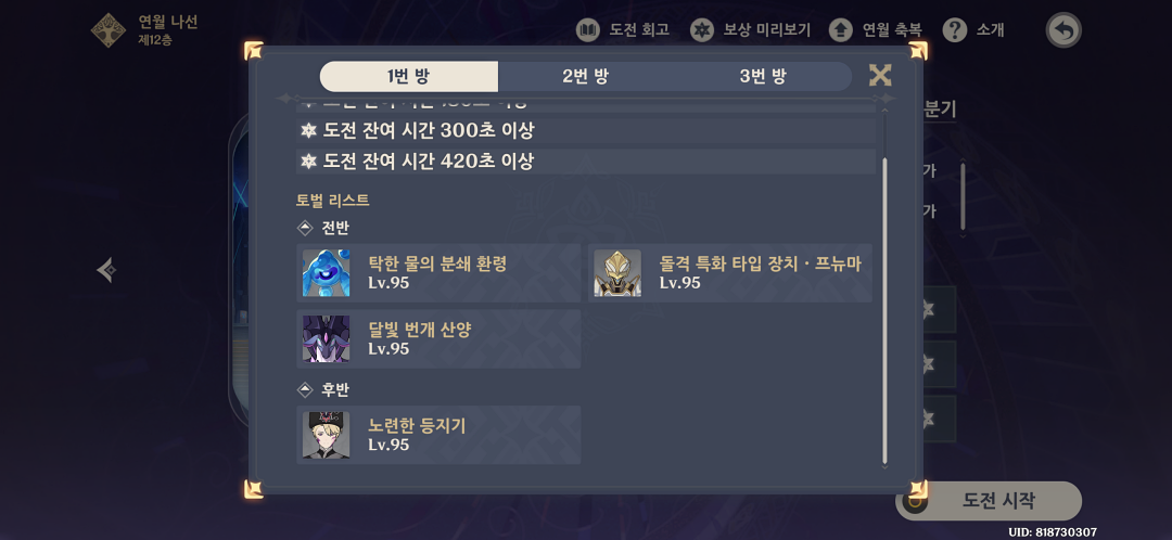 즉 전반부는 풀 원소와 물 원소 캐릭터의 조합이 후반부는 번개 원소와 물 원소 캐릭터 조합을 활용하는 것이 가장 좋음을 알 수 있습니다.
