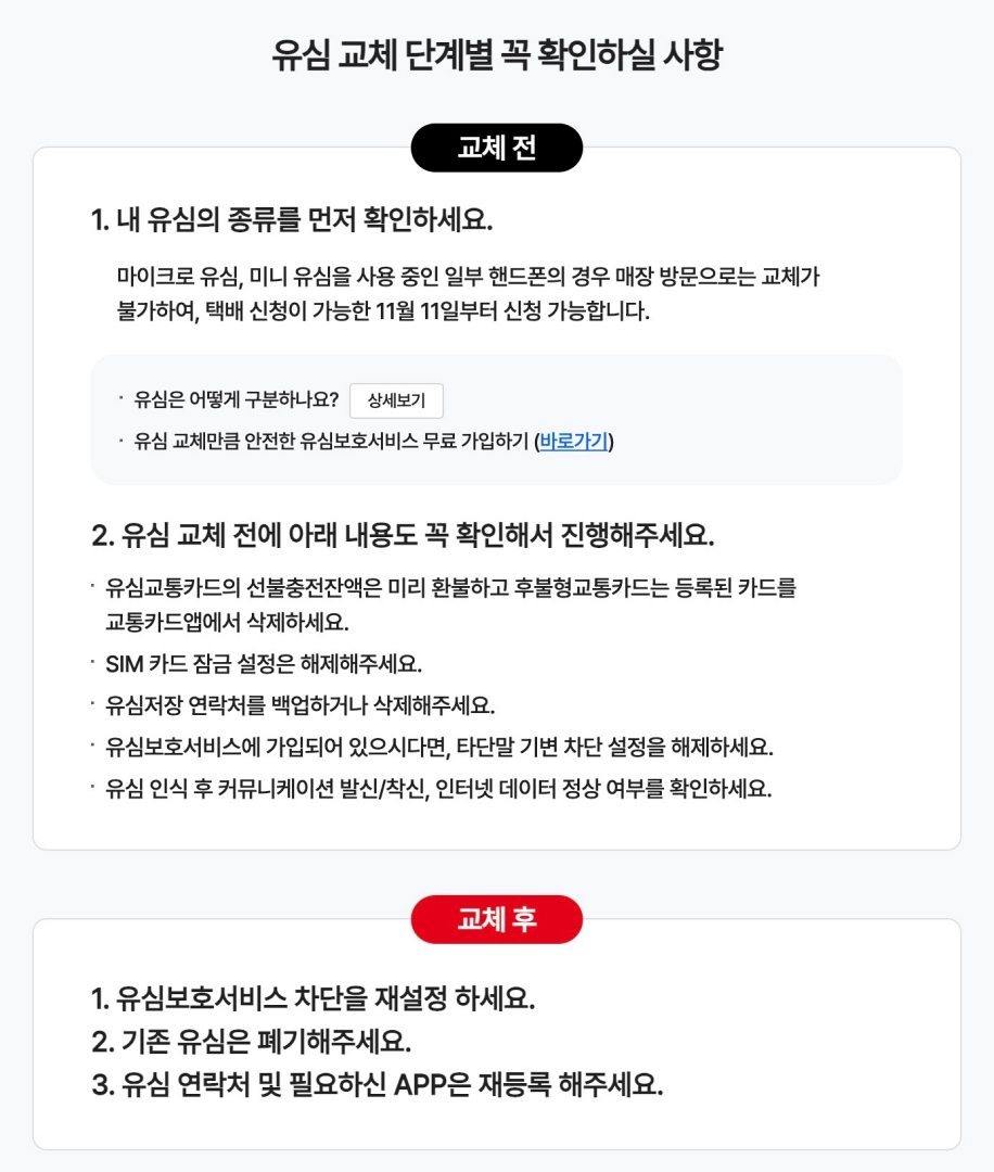 kt 홈페이지 유심 무료 교체 신청 페이지에서 방문 예약 혹은 택배 발송으로 신청할 수 있는데 택배 발송은 11월 11일부터 신청이 가능하니 당장 바꾸고 싶다면 방문 예약으로 신청하세요.
