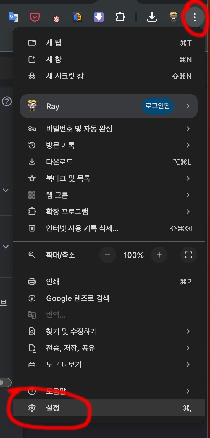 크롬 브라우저의 왼쪽 끝 메뉴에서 설정을 클릭 합니다.