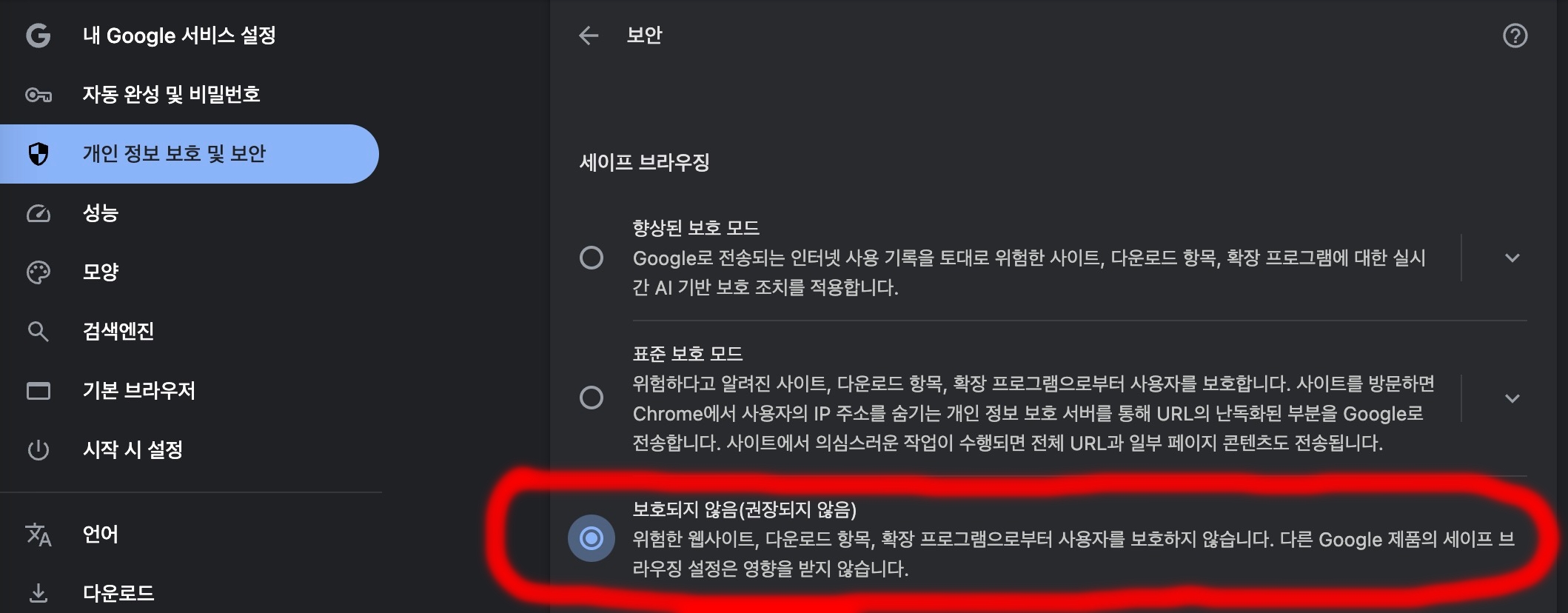 세이프 브라우징에 3가지 선택 항목이 나오는데 '향상된 보호 모드', '표준 보호 모드', '보호되지 않음(권장되지 않음)' 이 3가지중 '보호되지 않음(권장되지 않음)'을 선택후 다시 웹 사이트에서 다운로드를 시도하면 파일을 다운 받을 수 있습니다.