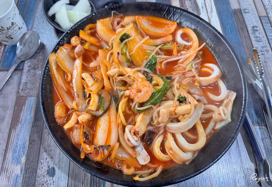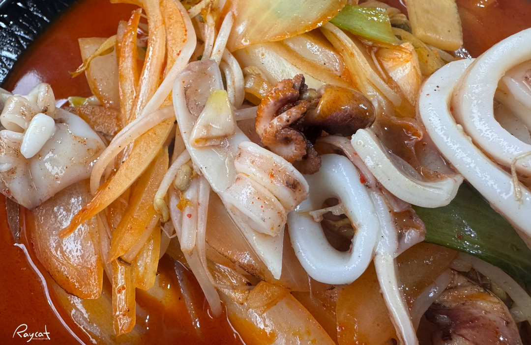 오징어 외에도 주꾸미, 새우에 숙주나물까지 다양한 해산물과 함께 얼큰한 국물이 매력이다.