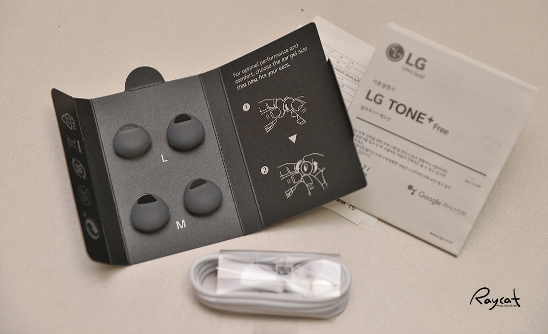 기본 구성품 액세서리를 보면 이어팁과 충전용 케이블 제품 보증서와 간단 사용설명서가 있습니다. 이어팁은 기본으로 스몰 사이즈가 끼워져 있는데 제 귀에 잘 맞았습니다.