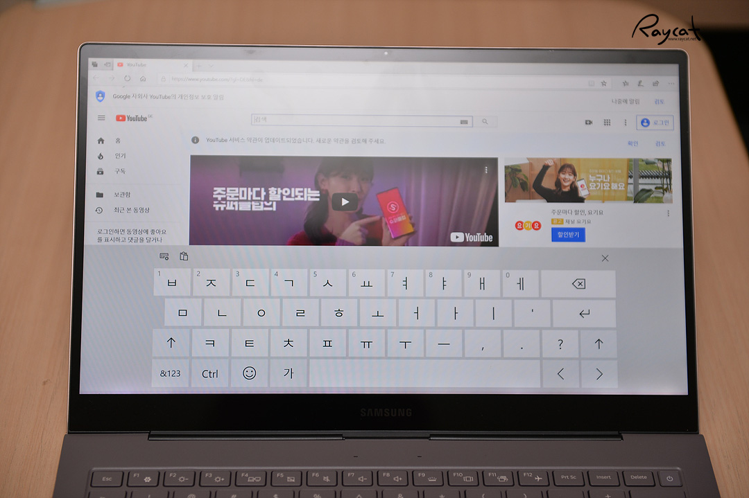 터치 디스플레이로 태블릿 모드로 전환할 경우 위 사진과 같이 화면에 키보드를 띄워서 사용하게 되는데 아무래도 회전경첩이 아니라서 그런지 디스플레이 키보드를 사용할 때 확실히 좀 불편한 부분이 있습니다.
