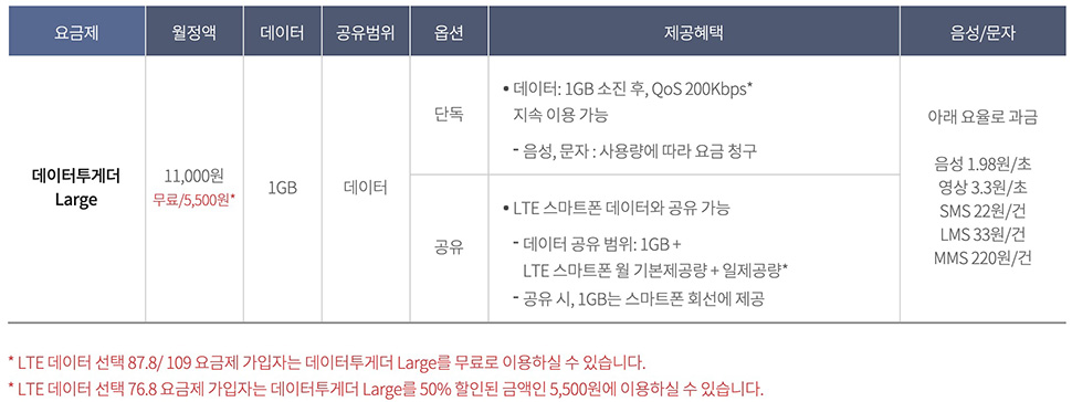 슈퍼플랜 프리미엄 / 스페셜 / 데이터ON 프리미엄, LTE 데이터선택 109 / 87.8 요금제를 사용하는 경우 기간내 데이터투게더 라지 월정액 요금은 계속 무료로 이용할 수 있습니다.