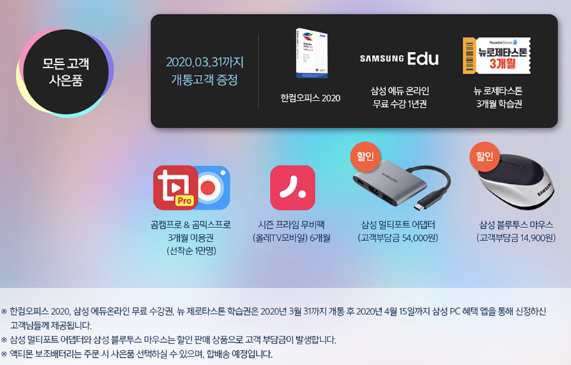 갤럭시북S 출시와 함께 삼성 블루투스 마우스, 한컴오피스2020 무료, 삼성에듀 1년, 로제타스톤 3개월, GOM Mix 3개월, 맥아피 1년, 시즌 프라임 무비팩 (올레TV모바일) 6개월, 삼성 멀티포트 어댑터, 삼성 블루투스 마우스 할인 구매가 가능합니다.