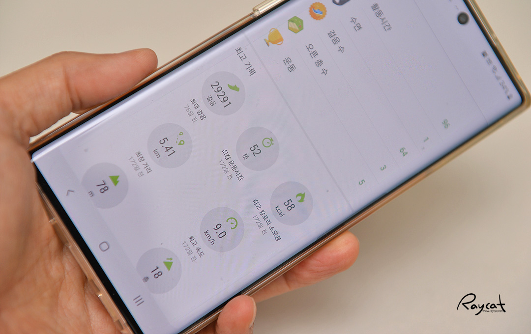 갤럭시 핏을 착용하고 다니면 일단 스마트폰에 모든 데이터가 기록되기 때문에 일주일 혹은 월단위로 내가 얼마나 걷고 있는지 운동은 하고 있는지 확인하기 꽤 쉽고 관리하기도 쉬운편 입니다.
