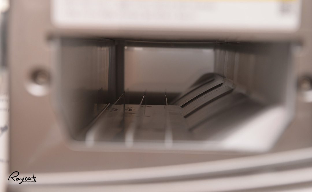 안쪽에 보면 물이 홈을 따라 아래로 떨어지는 것을 알 수 있습니다. 물을 다 넣은 후 물통을 다시 결합합니다. 이때 물통은 비워져 있어야 합니다.