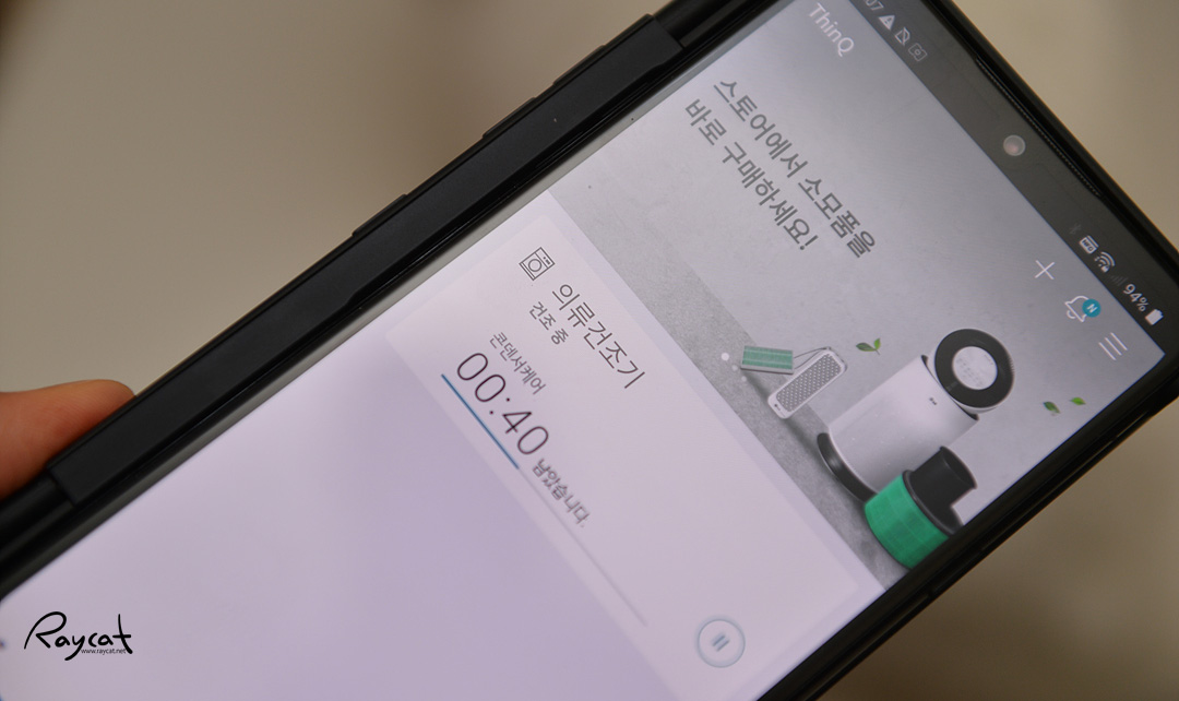 LG ThinQ앱으로 보면 콘덴서 케어 중이라며 남은 시간을 확인할 수 있습니다. 끝나면 어차피 알림이 오기 때문에 다른 걸 하면서 기다리면 됩니다.