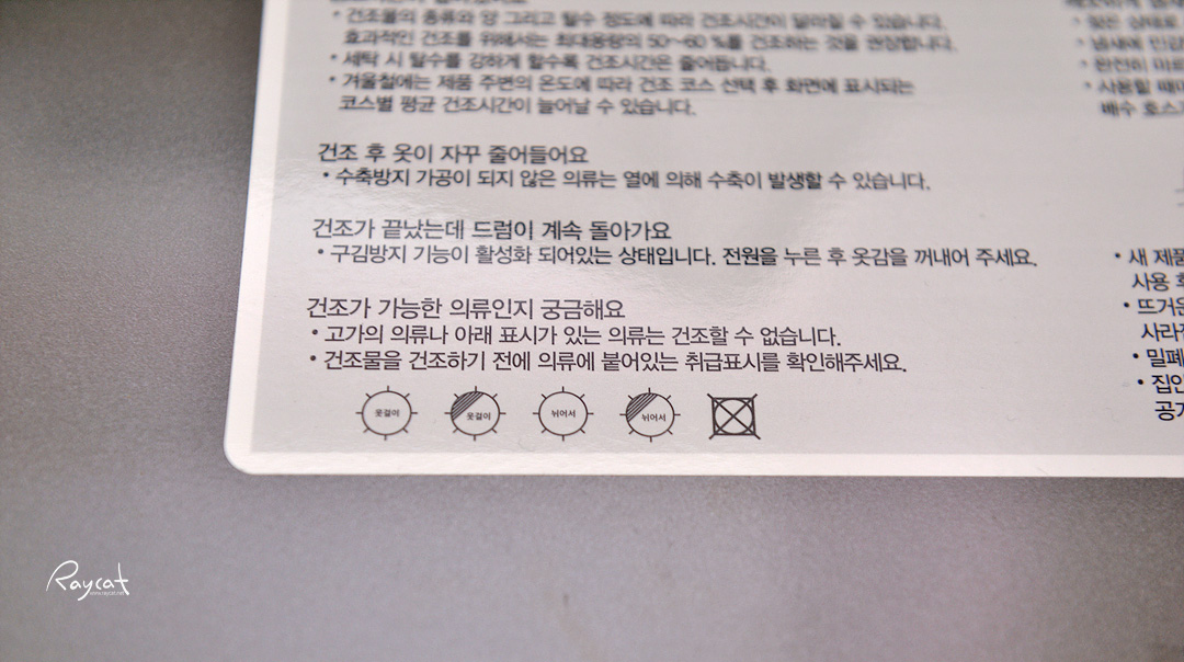 끝으로 건조기에 모든 의류가 건조가 가능한 것은 아닙니다. 건조기에도 주의 표시 스티커가 붙어있는데 세탁물에도 보면 위 스티커처럼 건조기에 사용할 수 없는 의류가 있습니다. 그런 의류의 경우는 자연 건조를 해줘야 합니다.