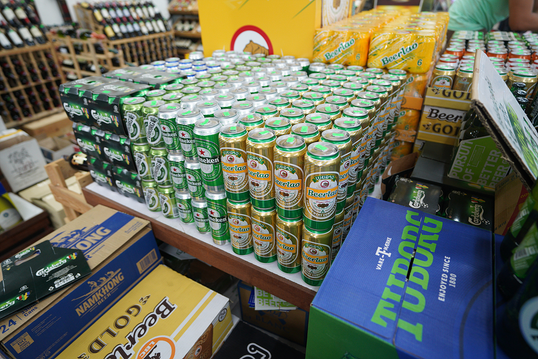 주류 코너는 라오 비어를 제외하면 모두 수입산으로 채워져 있는데 한국 맥주는 없지만 한국 소주는 종류별로 볼 수 있다.