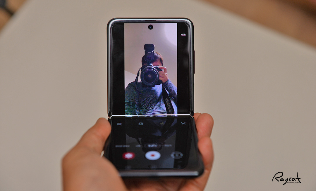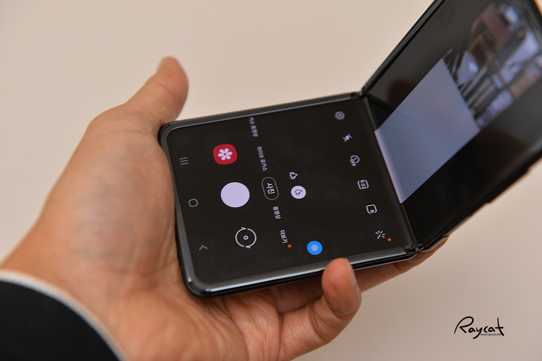 또 위 사진과 같이 갤럭시 Z 플립을 접어서 카메라를 사용할 경우 화면에 반은 촬영할 피사체를 보여주며 아래쪽에는 카메라 UI가 나와서 전면 카메라로 자신의 모습을 촬영할때나 요즘 유행하는 브이로그 촬영시 유용하게 활용할 수 있습니다.