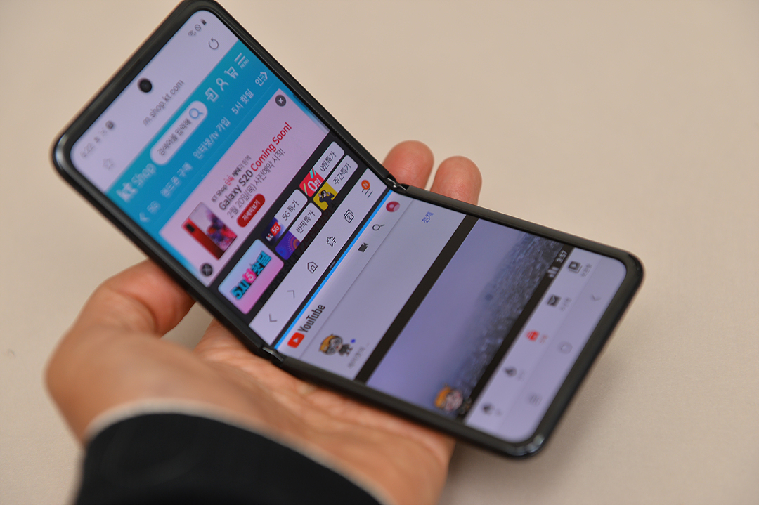 갤럭시 Z 플립의 경우 프리스톱 힌지를 활용해 펼쳤을 때 화면을 반반 나눠서 멀티태스킹 기능을 지원하지만 힌지를 원하는 각도로 접어서 화면을 2분할 해서 활용할 수 있습니다.