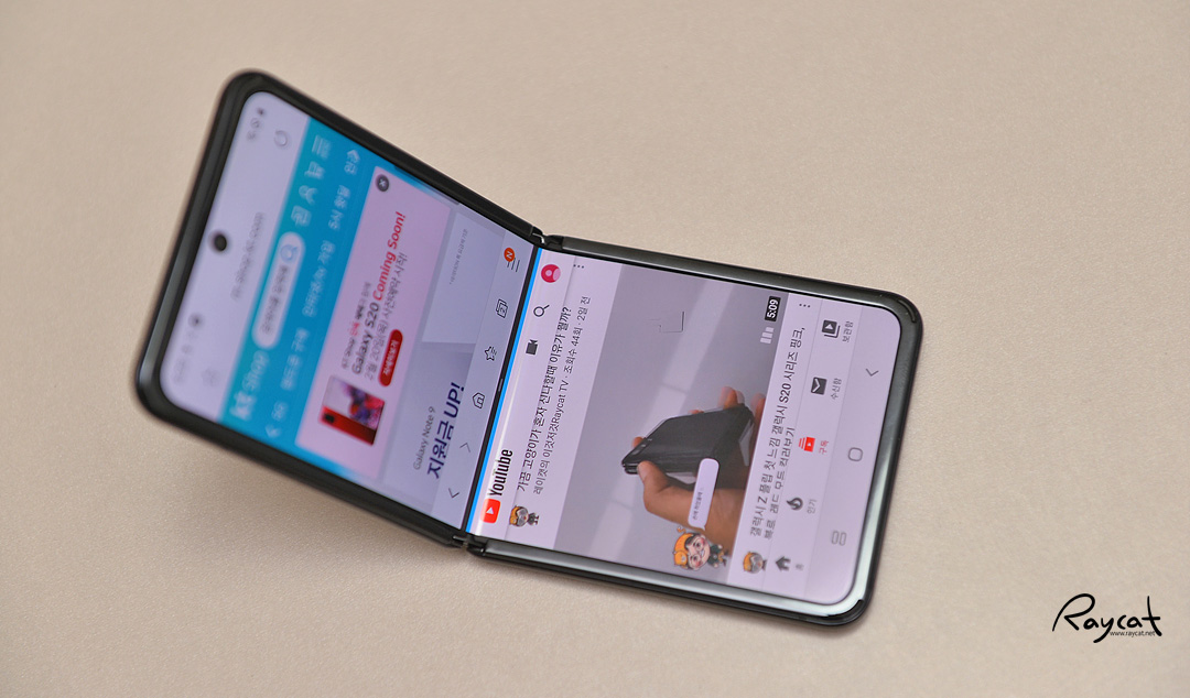 갤럭시 Z 플립의 경우 프리스톱 힌지를 활용해 펼쳤을 때 화면을 반반 나눠서 멀티태스킹 기능을 지원하지만 힌지를 원하는 각도로 접어서 화면을 2분할 해서 활용할 수 있습니다.