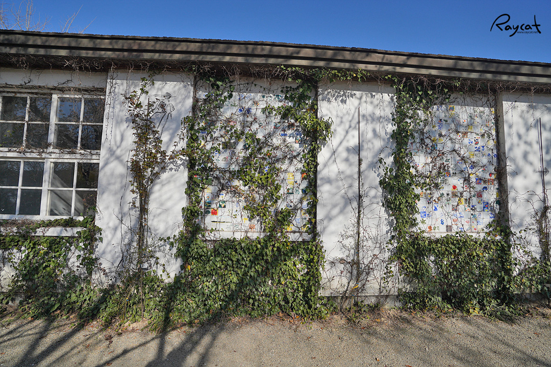 학교의 담벼락을 담쟁이 넝쿨이 감싸고 있다.