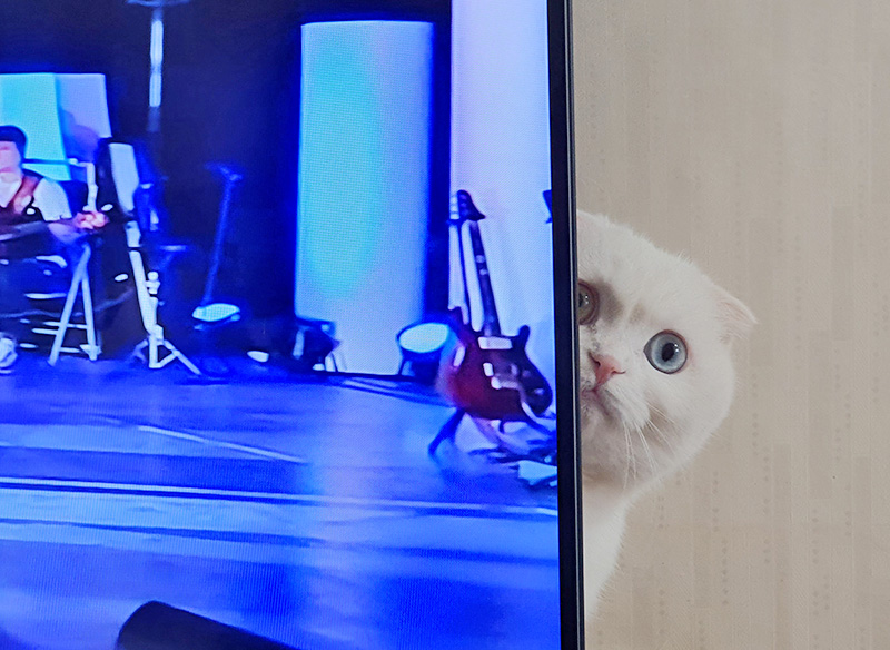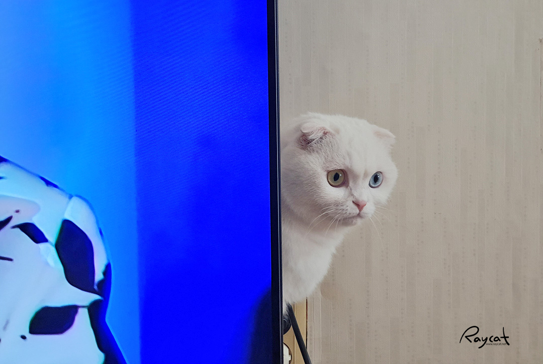 TV 뒤에서 왔다갔다 하며 고개를 내밀고 사람을 감시하는 고양이 입니다.