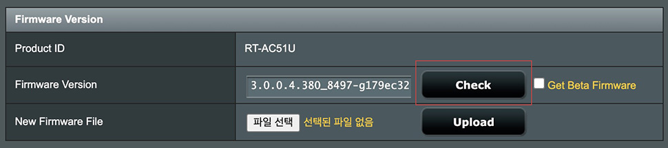 위 캡처 화면에서 붉은 네모로 영어로 firmware version 이라고 되어 있고 숫자가 있는데 현재 공유기의 펌웨어 버전을 의미하는 숫자로 그 숫자를 누르면 공유기 펌웨어 업데이트 화면으로 넘어갑니다.