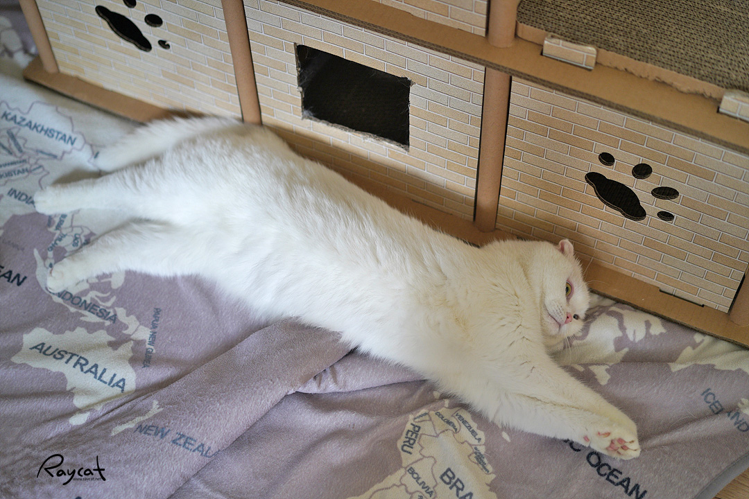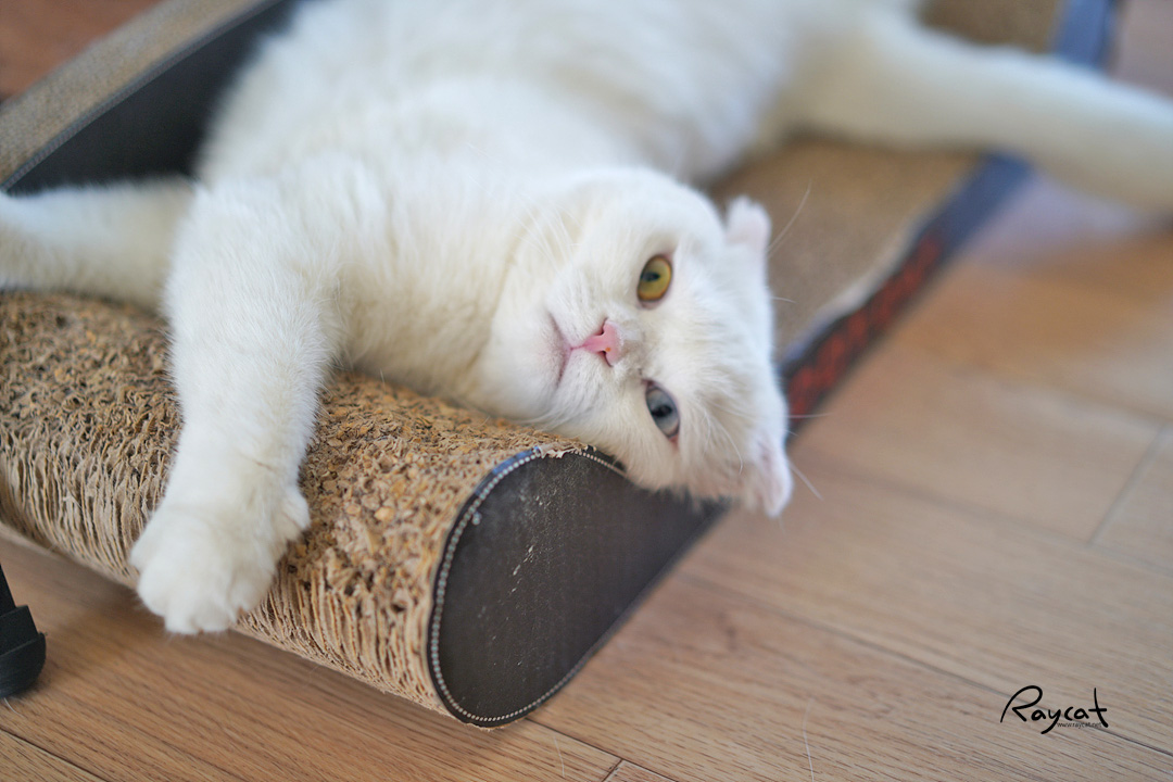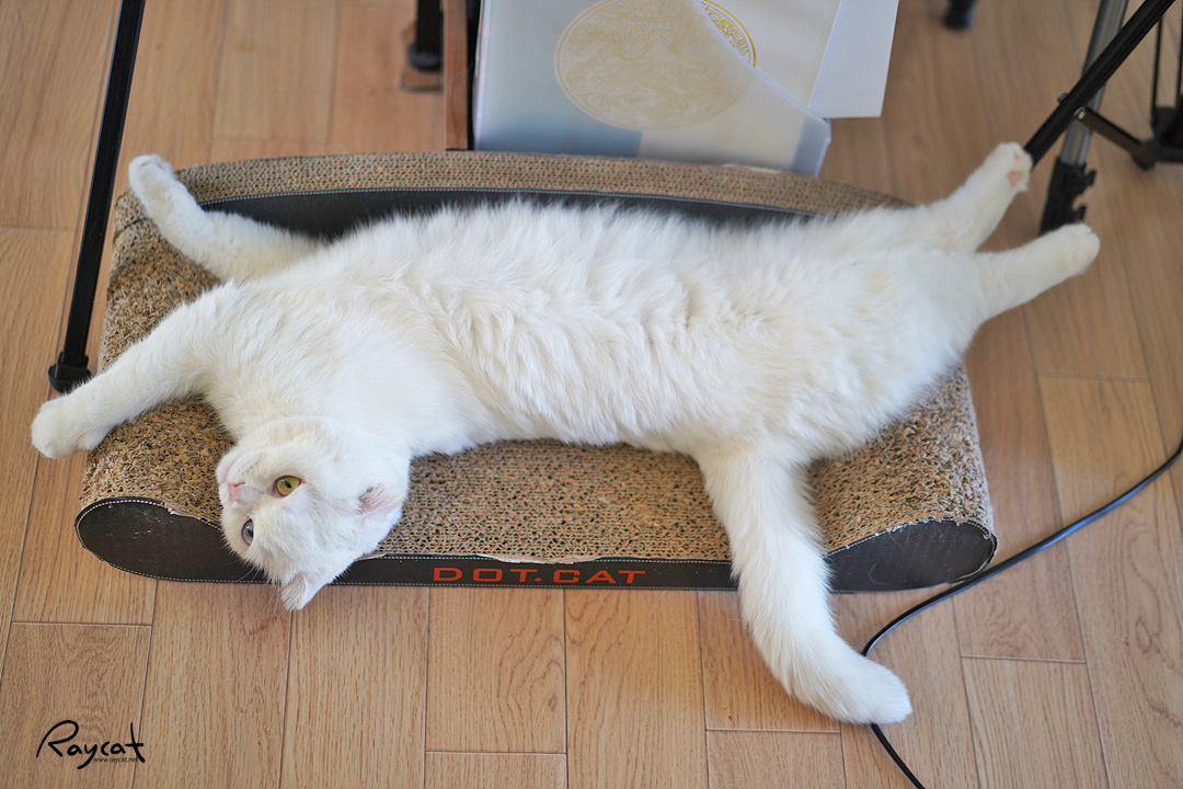 장난을 걸어오다 집사한테 반응이 없으면 밖으로 나가 심술난 얼굴로 제일 좋아하는 골판지 쇼파에 드러누워 있습니다.