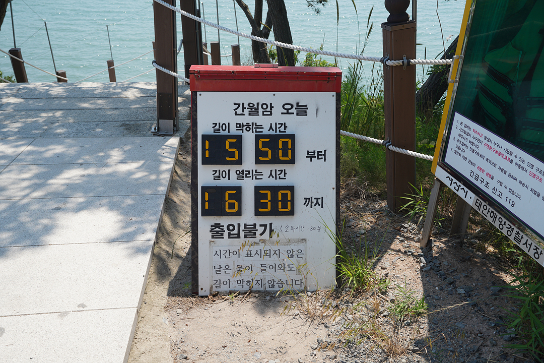 간월암은 계절에 따라 물때가 다르다. 그래서 방문을 계획한다면 꼭 간월암 홈페이지에 방문해서 물이 들어오는 시간과 나가는 시간을 확인해봐야 한다. 섬 위에 지어진 암자라 물이 들어오면 건너갈 수도 없고 나갈 수도 없다.