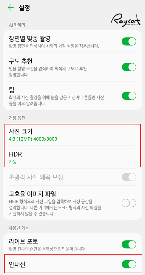 그리고 사진 촬영시 사용할 수 있는 설정은 동영상 촬영보다 더 많은데 초보자를 위한 장면별 맞춤이나 구도 추천과 팁은 필요하면 설정해 두면 됩니다.