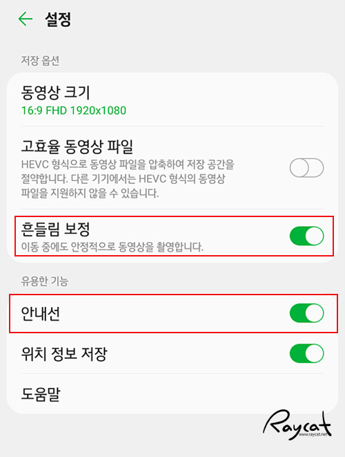 먼저 카메라를 사용하기 전에 카메라 설정을 미리 해두는 게 좋습니다. 카메라 설정에서 저 같은 경우 HDR 자동, 안내선은 늘 켜 두고 사용하고 있습니다. 먼저 동영상 설정을 보면 안내선, 흔들림 보정을 켜두고 사용하는 게 좋습니다.