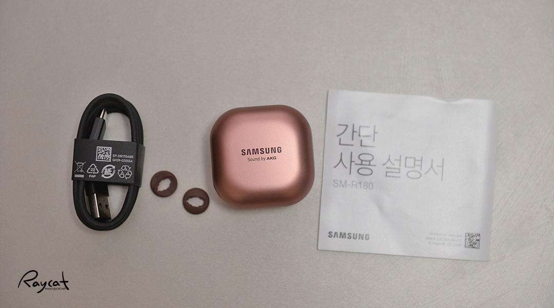 갤럭시 버즈 라이브 구성품을 보면 이어버드, usb-c 케이블, 이어팁, 간단 사용 설명서가 있습니다.